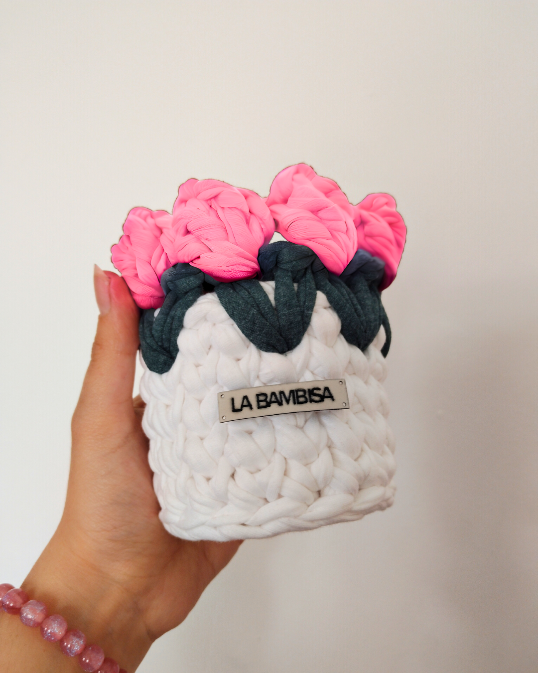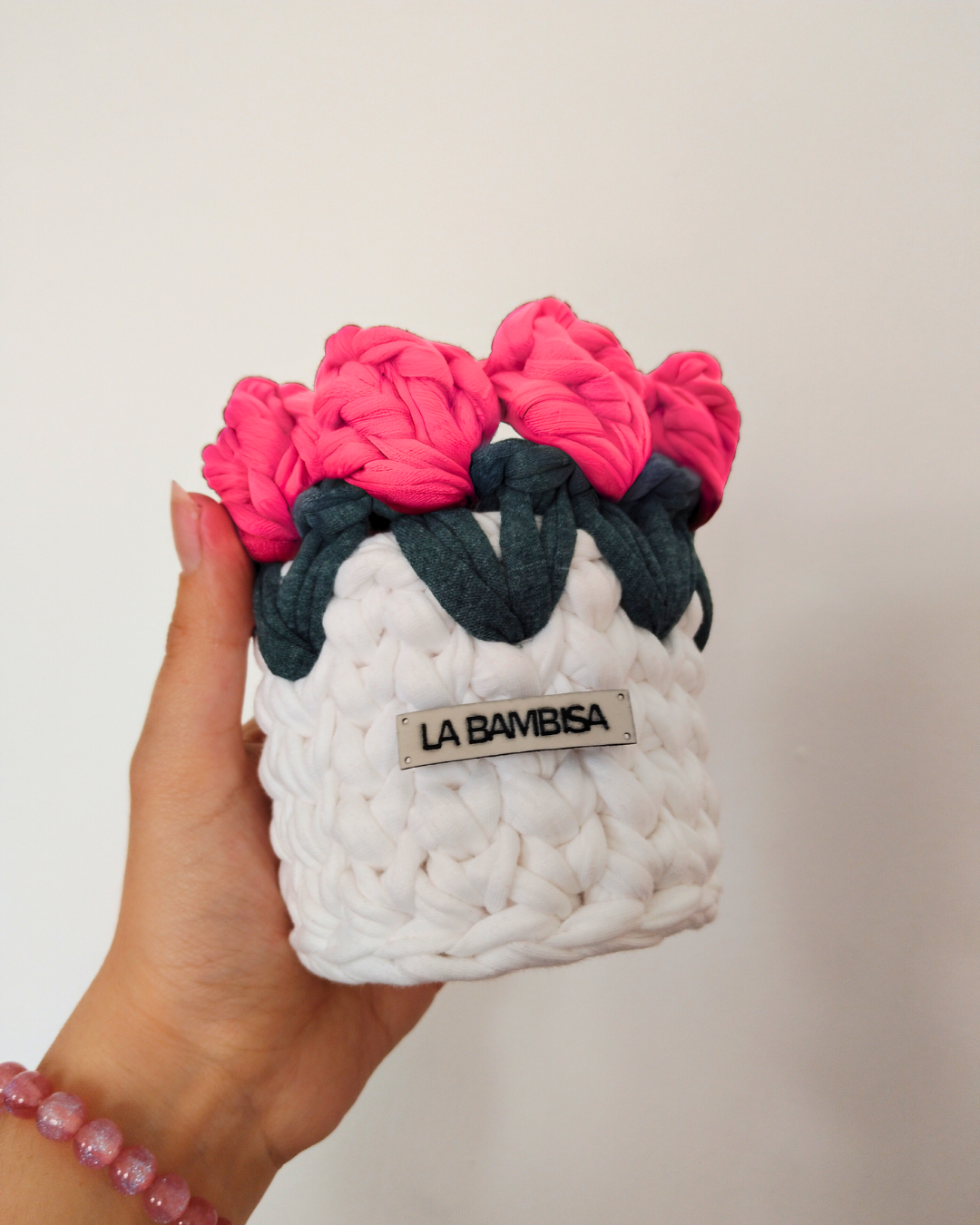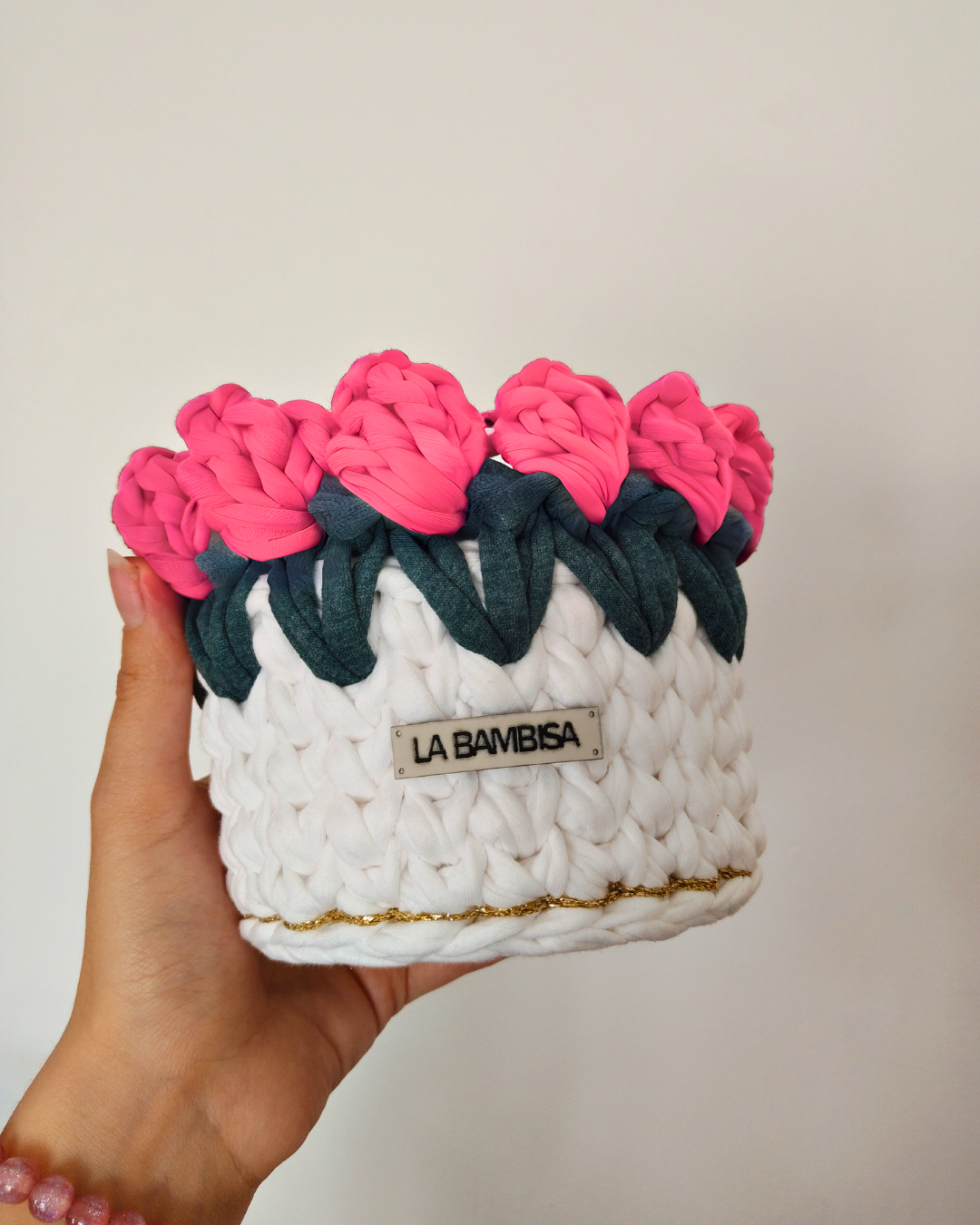 Este cesto es una pieza decorativa hecha a mano en técnica de crochet con trapillo. Su diseño destaca por la base blanca con un delicado detalle en hilo dorado y la parte superior adornada con tulipanes tejidos en distintos tonos y hojas verdes, lo que le da un aspecto fresco y alegre.
