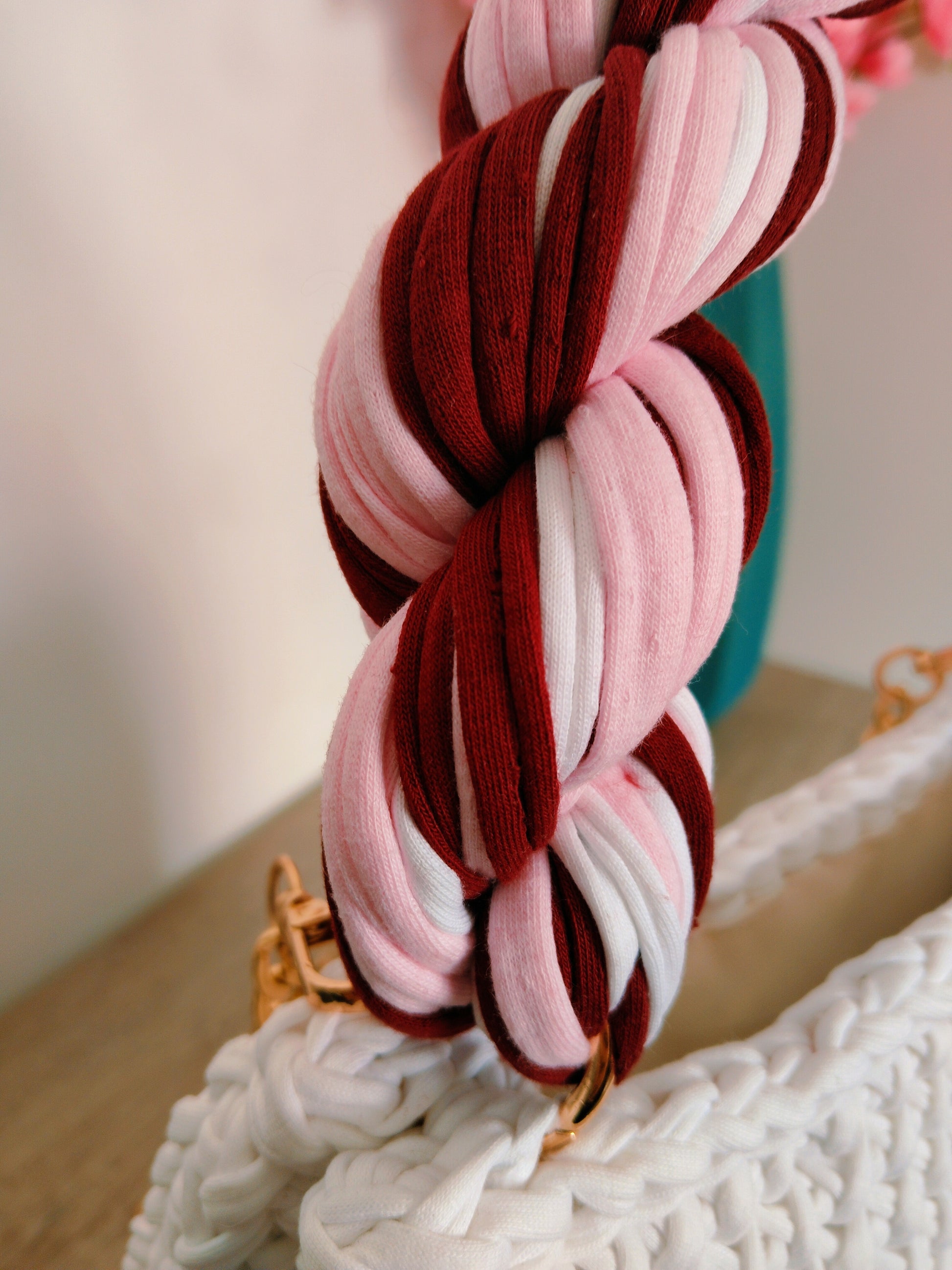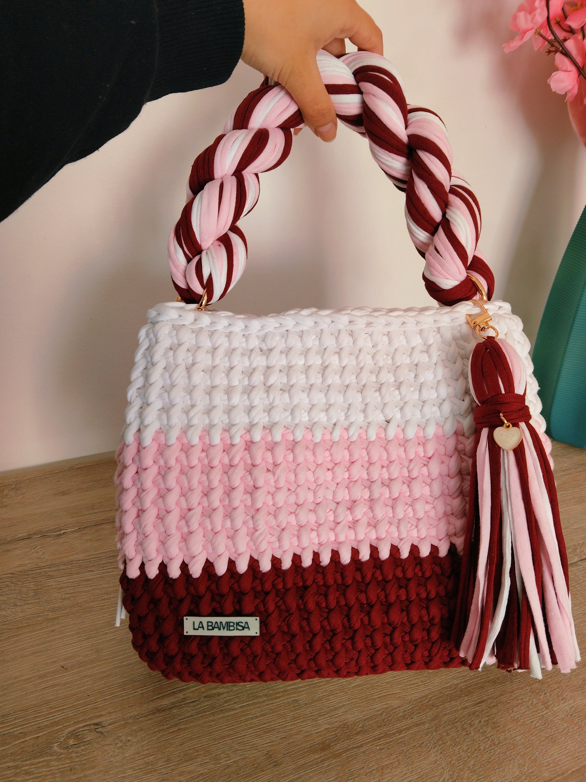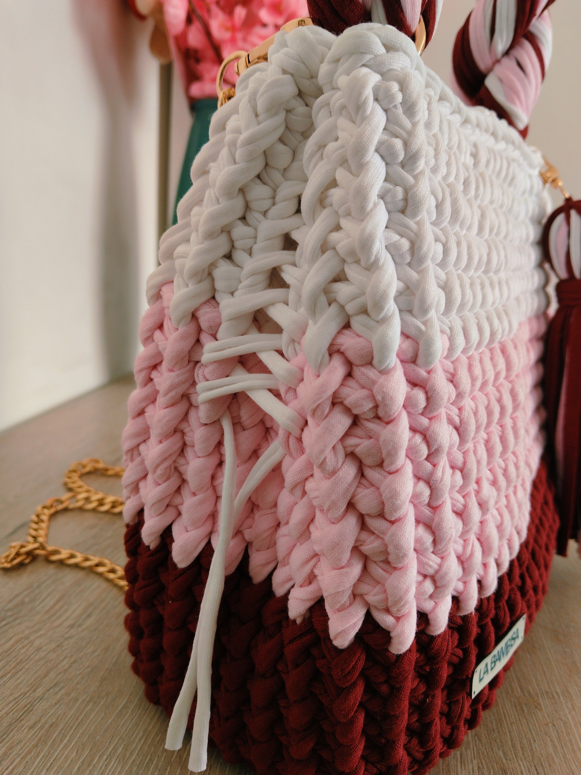 Precioso modelo en tres colores: burdeo, rosa y blanco, tejida en punto cruzado con trapillo de alta calidad 😍
